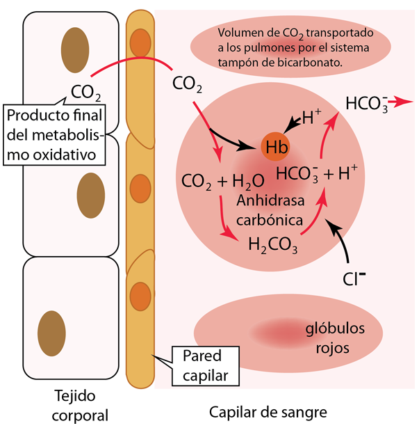 Transporte del Dióxido de Carbono a los PulmonesLos procesos metabólicos del cuerpo, como las reacciones en el ciclo TCA, liberan dióxido de carbono en los fluidos corporales. Este CO2 debe ser excretado del cuerpo transportándolo a los pulmones para exhalarlo. El metabolismo activo en la célula produce CO2 y reacciona con el agua para formar iones bicarbonato HCO-3 e iones hidrógeno H+. Como se describió anteriormente con el efecto Bohr, este proceso reduce el pH de la célula y hace que se libere más oxígeno. De esta forma, el CO2 ayuda a aportar el oxígeno necesario para las demandas metabólicas de la célula. En algún momento, el exceso de CO2 debe eliminarse para mantener un equilibrio adecuado en la célula. Mientras que aproximadamente el 98,5% del suministro de oxígeno a las células lo transporta la hemoglobina en comparación con el 1,5% disuelto en la sangre, el transporte de CO2 es profundamente diferente. El dióxido de carbono como gas es más soluble que el oxígeno en la sangre, y aproximadamente del 5 al 7% se disuelve en la sangre para ser transportado a los pulmones. Aproximadamente el 10% del CO2 se une a las proteínas plasmáticas o ingresa en los glóbulos rojos para unirse a la hemoglobina para su transporte. Cuando el dióxido de carbono se une a la hemoglobina, primero forma iones de bicarbonato HCO-3 e iones de hidrógeno H+ como se describió anteriormente y luego se une a uno de los grupos amino de la hemoglobina: ![]() La mayoría de las moléculas de dióxido de carbono (85%) son transportadas a los pulmones por el sistema tampón de bicarbonato. El dióxido de carbono se difunde en los glóbulos rojos donde la enzima anhidrasa carbónica (CA) lo convierte rápidamente en ácido carbónico (H2CO3). El ácido carbónico es una molécula intermedia inestable que se disocia inmediatamente en iones bicarbonato. Este es un camino empinado favorable desde el CO2 hasta el HCO-3, hacia abajo de su gradiente de concentración de modo que el CO2 pueda continuar entrando en las células de glóbulos rojos. Esto también produce iones H+, que si se acumulan producirían cambios peligrosos en el estrictamente regulado pH de la sangre. Aquí el papel de la hemoglobina en los glóbulos rojos es unirse a estos iones H+, lo que limita su efecto sobre el pH. Los iones de bicarbonato recién sintetizados se transportan fuera de los glóbulos rojos al contenido líquido de la sangre a cambio de un ion cloruro Cl-. (Esto se llama desplazamiento de cloruro). Cuando la sangre llega a los pulmones, el bicarbonato se transporta de regreso al interior de los glóbulos rojos a cambio del Cl-. Los iones H+ se disocian de la hemoglobina y se unen al bicarbonato, produciendo el ácido carbónico intermedio. Este ácido carbónico se convierte nuevamente en CO2 por la acción de la enzima anhidrasa carbónica y se difunde en los alvéolos de los pulmones para la exhalación. ![]() El notable logro de esta cadena de eventos es transportar grandes cantidades de CO2 desde el metabolismo celular donde se liberan, a los pulmones donde se exhalan con muy pocos cambios en el pH de la sangre. Tenga en cuenta que en el estudio del efecto Bohr hay una discusión de los cambios de pH de aproximadamente 7,6 a 6,8 dentro de las células, pero el pH de la sangre en sí está limitado en un rango de aproximadamente 7,35 a 7,45 con consecuencias graves a fatales para las excursiones fuera de ese rango. Esta enzima clave, la anhidrasa carbónica, logra lo que se llama el sistema tampón de bicarbonato que utilizamos con cada respiración que tomamos.