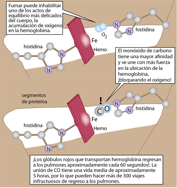Tabaquismo y HemoglobinaUno de los principales riesgos del tabaquismo para la salud tiene que ver con la unión del monóxido de carbono a la hemoglobina, bloqueando la unión del oxígeno y disminuyendo el suministro de oxígeno a los tejidos. ![]() El artículo al que se hace referencia a continuación sobre el monóxido de carbono sugiere los siguientes datos sobre el monóxido de carbono [los datos de estos comentarios no se han verificado cuidadosamente]: "El monóxido de carbono se une mucho más rápido a la hemoglobina que al oxígeno (aproximadamente 200 veces más rápido)". "El monóxido de carbono se conecta rápidamente con los glóbulos rojos, pero es lento en salir del cuerpo y tarda hasta un día en exhalarse a través de los pulmones". "El nivel normal de COHb en el torrente sanguíneo debido a la exposición ambiental es menos del 1% . Un fumador de un paquete al día puede tener del 3% al 6% de COHb en la sangre. ... En un fumador de tres paquetes al día, los niveles de COHb pueden llegar al 20% ". Medical News Today afirma que el monóxido de carbono se elimina del cuerpo en 12 horas. Un artículo del NIH sugiere una vida media de 4,5 horas para el monóxido de carbono que sale del cuerpo después de fumar.