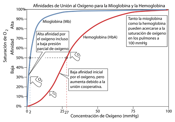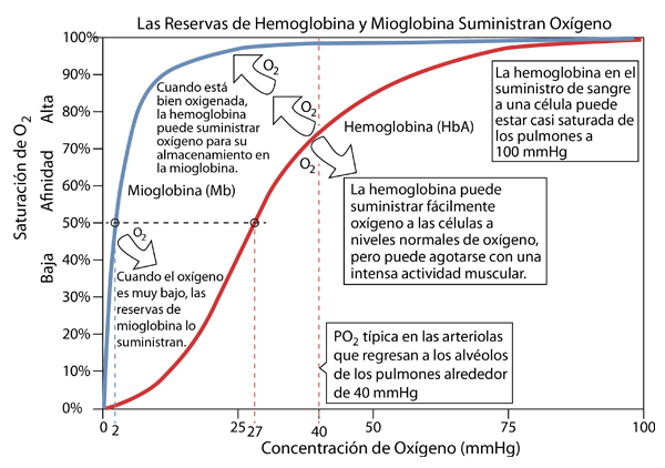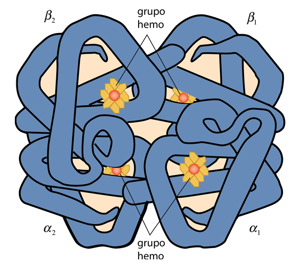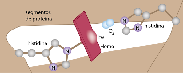 La hemoglobina es una proteína esencial en el cuerpo, que realiza la mayor parte del transporte de oxígeno en la sangre. La hemoglobina contiene hierro que le da un color rojo y aporta ese color a los glóbulos rojos y a la sangre misma. ![]() La hemoglobina consta de dos tipos de componentes llamados hemo y globina. La globina es una proteína de 574 aminoácidos en cuatro cadenas polipeptídicas. Cada una de esas cadenas está asociada con un grupo hemo. Cada grupo hemo rodea un átomo de hierro y cada átomo de hierro puede unirse libremente con un átomo de oxígeno. Al unirse hasta con cuatro moléculas de oxígeno, la hemoglobina forma el compuesto llamado oxihemoglobina. La mioglobina consta de una cadena polipeptídica similar a una de las cuatro en la estructura anterior y puede unirse solo a una molécula de oxígeno. Es abundante en las células musculares y actúa como un lugar de almacenamiento de oxígeno al que la célula recurre en momentos de bajo suministro de oxígeno. Cualquier animal de más de unos pocos milímetros de tamaño debe garantizar un suministro constante de oxígeno a las células de todo su cuerpo y eliminar los productos de desecho como el dióxido de carbono. En todos los vertebrados e incluso en alguna vida microscópica, la proteína de transporte es la hemoglobina. La mayoría de los animales también utilizan la mioglobina en el tejido muscular para proporcionar una reserva de oxígeno durante períodos de alta demanda de oxígeno.
