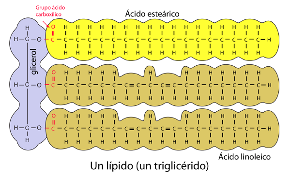 LípidosLas grasas, los aceites, las ceras y los esteroles, son conocidos colectivamente como lípidos. Al igual que los hidratos de carbono, las verdaderas grasas contienen sólo carbono, hidrógeno, y oxígeno. Las moléculas de este tipo de lípido se componen de una molécula de glicerol con tres moléculas de ácidos grasos unidos a ella. Este tipo de lípidos también se llama triglicérido. ![]() Los fosfolípidos son una clase importante de lípidos que forman las membranas celulares. La clase de compuestos llamados esteroides también son lípidos. El colesterol es uno de los esteroides.