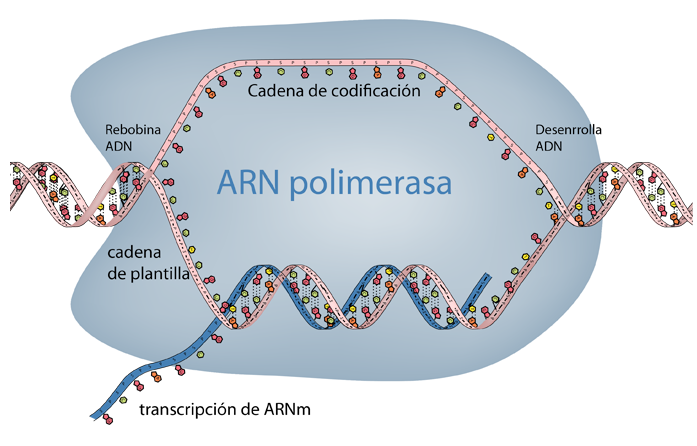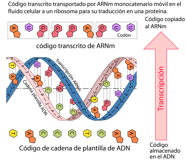 Transcripción de un Segmento Corto de ADN![]() El código genético se utiliza para almacenar modelos de proteínas en el ADN, escrito en un alfabeto de bases en forma de tripletes llamados codones. El modelo de una proteína se transcribe el ARN mensajero. |
