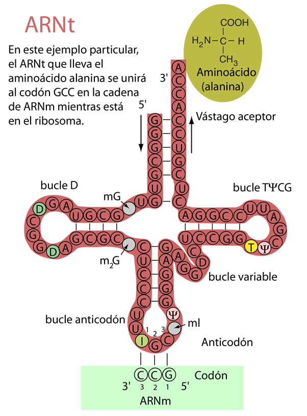 El ARN de TransferenciaEl ácido ribonucleico (ARN) que se acopla directamente en la traducción de la secuencia de nucleótidos en el ARN mensajero, a secuencias de aminoácidos para la construcción de proteínas, se denomina ARN transferente o comúnmente ARNt. La fabricación del propio ARNt es dirigida por el ADN en la célula, que proporciona un patrón para la producción del ARN por "transcripción". Abajo se muestra una ilustración de la composición de un ejemplo de ARNt, en lo que comúnmente se llama su forma de hoja de trébol. Es una proyección bidimensional de la forma de la molécula. Su forma tridimensional real es más compleja, pero esta es una manera común de describirla para enfatizar su función de enlace de un aminoácido a un extremo correspondiente al anticodón en el extremo opuesto. Este anticodón enlazará con un codón que consta de tres bases nitrogenadas, que especifican un aminoácido de acuerdo con el código genético. Esta ilustración sigue el modelo de un ejemplo en Rana. Este ARNt fue investigado en la levadura y su estructura fue la culminación de siete años de trabajo de Robert Holley de la Universidad Cornell. ![]() Cuando el patrón del RNA mensajero de una proteína, llega a un ribosoma para el proceso de construcción de otra proteína por traducción de ese patrón, las moléculas de ARNt con todos los aminoácidos requeridos, deben estar presentes para que el proceso continúe. Como la mayoría de las proteínas utilizan los veinte aminoácidos, todos deben estar disponibles, unidos a las moléculas de ARNt correspondientes. En este ejemplo, el ARNt se ha unido al codón GCC en el ARNm, siendo el GCC uno de los codones correspondientes a la alanina. Esto lleva a colocar la alanina en el lugar apropiado de la cadena polipeptídica en crecimiento, la cual va a convertirse en proteína.