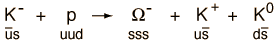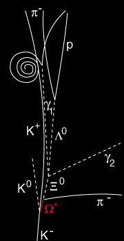 El omega-menos fue producido por una colisión de una partícula K- con un protón, que produjo la partícula omega-menos y dos kaones.