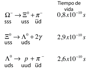 | Omega | Ω- | sss | 1672 | 3/2 | +1 | -3 | 0,82 x10-10 | Ξ0π-, Λ0K- |