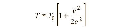 | Cálculo del Desplazamiento de Tiempo CinemáticoSi se expande la expresión de la dilatación del tiempo cinemático  Esta expresión puede utilizarse para calcular la dilatación del tiempo en el experimento de Hafele-Keating en el cual, se tomó un reloj atómico a bordo de una aeronave y se comparó con un reloj situado en la tierra. El problema encontrado con la medición de la diferencia entre un reloj de superficie y uno en una aeronave, es que ninguna ubicación es realmente un marco inercial. Si se toma el centro de la Tierra como una aproximación a un sistema inercial, entonces se puede calcular la diferencia entre un reloj de superficie y el reloj de la aeronave. Tomando un "tiempo propio" en el centro de la tierra, como si el reloj maestro estuviera allí, el tiempo medido por un reloj en la superficie sería mayor  y eso para el reloj en el aire sería aproximadamente  debido al nivel de las aproximaciones usadas, la altura de la aeronave no cambia significativamente el radio R. La diferencia en los tiempos en comparación con nuestro hipotético reloj maestro sería entonces  Ahora bien, esta relación es el inverso del experimento real, ya que se ha asumido que el reloj está en el centro de la tierra, mientras que los relojes reales están en los marcos que se están moviendo con respecto al centro. La expresión de diferencia de tiempo debe ser válida, pero al comparar el reloj del avión con el de la superficie, se debería encontrar que va por detrás, por tanto podemos modelar esa diferencia horaria por