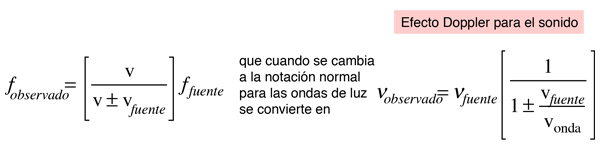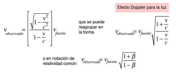 | Desplazamiento Doppler RelativistaEl desplazamiento Doppler normal para las ondas de sonido, que se mueven con velocidades v mucho menor que c, viene dada por la expresión  donde se toma el signo más, para las ondas que viajan alejándose del observador. Para la luz y otras ondas electromagnéticas, la relación debe ser modificada para ser compatible con la transformación de Lorentz, y se convierte en la expresión  Aquí v es la velocidad relativa de fuente y observador y se considera positiva cuando la fuente se está acercando.