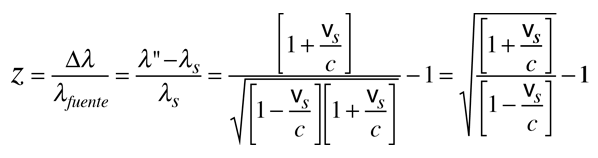 | Variación de la Longitud de Onda FraccionalCon propósitos de determinar la velocidad de recesión de estrellas y galaxias con el efecto Doppler, por observación del desplazamiento al rojo de las líneas espectrales, es conveniente expresar el efecto Doppler en términos del desplazamiento en la longitud de onda, comparada con la longitud de onda de la fuente. Para estos propósitos en la fórmula de la longitud de onda, es mas conveniente definir una velocidad de recesión positiva:  La variación de longitud de onda fraccional, se define con el parámetro z, el cual caracteriza los desplazamientos al rojo:  En términos de los habituales símbolos de relatividad, esto se convierte en