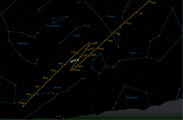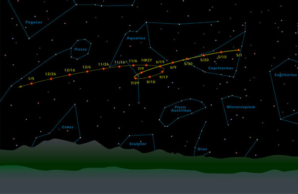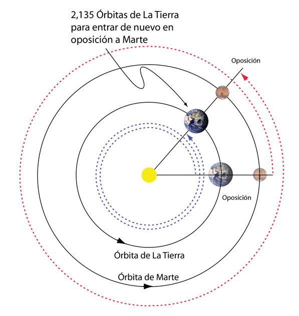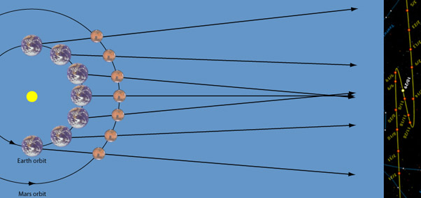 | Movimiento Retrógrado de MarteComo resultado de la naturaleza de las órbitas de la Tierra y de Marte alrededor del Sol, hay momentos en que Marte parece estar viajando hacia atrás durante un tiempo corto en comparación con las "estrellas fijas". Abajo se tiene las ilustraciones de la NASA/JPL-Caltech del sitio http://mars.jpl.nasa.gov/allabout/nightsky/nightsky04.html  Mirando hacia arriba en el cielo cada noche a la misma hora, por lo general se observa que Marte está un poco más hacia el este, en comparación con las constelaciones. Sin embargo, aproximadamente cada dos años cuando se observa igualmente a la misma hora, hay un par de meses, donde parece que Marte se mueve de este a oeste (movimiento retrógrado). Lo de arriba es el patrón observado en 2003.  Esta es la trayectoria aparente de Marte durante 2005 cuando mostró un movimiento retrógrado durante aproximadamente un período de dos meses.  Este movimiento hacia atrás o retrógrado era un misterio para los primeros observadores, y les llevó a la utilización de la palabra "planeta", del término griego que significa "vagabundo". Con nuestra actual comprensión de que la Tierra viaja alrededor del Sol en un año, mientras que el más lejano Marte tiene un período sideral de 1,88 años terrestres, está claro que la Tierra periódicamente "alcanzará" a su más lejano vecino. A medida que la Tierra se mueve hacia adelante en su órbita, Marte parecerá deslizarse hacia atrás en comparación con su más común marcha hacia el este a través del cielo.  Desde el momento en que la Tierra y Marte están en línea a través del Sol (llamado estar en "oposición") a la siguiente oposición hay 2,135 órbitas terrestres. En este corto período de tiempo incluyendo el tiempo de oposición, es cuando Marte exhibe su movimiento retrógrado para un observador en la Tierra. El período de tiempo entre oposiciones se llama período sinódico. | Índice Ilustración del Sistema Solar Conceptos del Sistema Solar Conceptos de Marte Referencia Carroll & Ostlie Cap.1 | ||