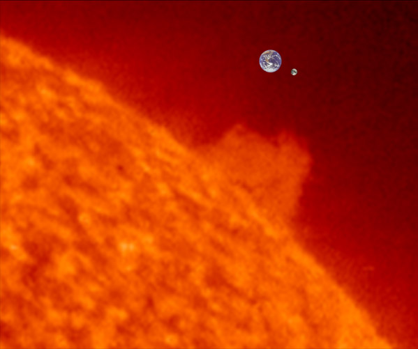 La órbita de la Tierra varía desde 1,47 a 1,52 x 1011 metros del Sol. El tiempo de viaje promedio de la luz a la Tierra es de 8,3 minutos. El radio del Sol de 696.000 kilometros, es unas 109 veces el radio de la Tierra. Su gravedad en la superficie es de 274 m/s2 o 28 veces la de la Tierra. Su densidad media es de 1410 kg/m3 o 0,255 veces la densidad media de la Tierra   |  | El diámetro del Sol de 1.392.000 kilometros, es de 109 veces el diámetro ecuatorial de la Tierra de 12.756 km. La distancia desde el Sol a la Tierra de 149.000.000 kilometros = 1 UA, es de 107 veces el diámetro del Sol, y 388 veces la distancia Tierra-Luna. La distancia Tierra-Luna no se muestra a escala en la imagen compuesta anterior. El diámetro del Sol es de 3,6 veces la distancia Tierra-Luna. Arriba, la Tierra y la Luna está a escala en relación con una imagen del Sol hecha por el satélite SOHO el 12 de enero de 2007. |