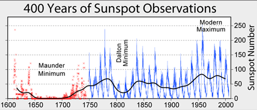 | El Mínimo de Manchas Solares Maunder"El mínimo de Maunder es el nombre dado al período aproximadamente desde 1645 a 1715, cuando las manchas solares se convirtieron en sumamente raras, como lo señalaron los observadores solares de la época. Lleva el nombre del astrónomo solar Edward W. Maunder (1851 - 1928), quien descubrió la escasez de las manchas solares durante ese período, mediante el estudio de los registros de esos años. Durante un período de 30 años dentro del Mínimo de Maunder, por ejemplo, los astrónomos observaron sólo 50 manchas solares, en contraposición a uno más típico 40.000 a 50.000 manchas ".  El texto y la imagen de arriba son de Wikipedia y se pueden utilizar libremente bajo las condiciones de uso. | Índice Ilustración del Sistema Solar Conceptos del Sistema Solar Conceptos del Sol Referencia Chaisson & McMillan Sec 16.4 | ||