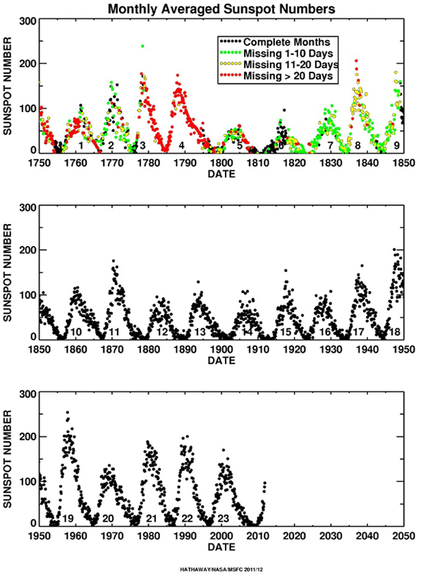 | El Ciclo de Manchas SolaresLos datos a largo plazo que se muestran a continuación son del sitio de Solar Science de la NASA. La naturaleza periódica ha persistido durante cientos de años.  Referencias: | Índice Ilustración del Sistema Solar Conceptos del Sistema Solar Conceptos del Sol Referencia Chaisson & McMillan Sec 16.4 | ||