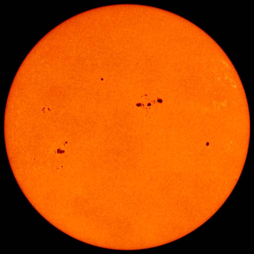 Un modelo para la naturaleza de las manchas solares es que los intensos campos magnéticos inhiben o redirigen el flujo de convección de los gases calientes, que es normalmente hacia la superficie. Siglos de observaciones han demostrado que hay un ciclo de 11 años entre los máximos de actividad solar. Hay un período de actividad excepcionalmente bajo llamado mínimo de Maunder. | Índice Ilustración del Sistema Solar Conceptos del Sistema Solar Conceptos del Sol Referencia Chaisson & McMillan Sec 16.4 | ||||