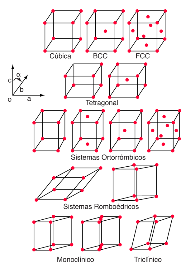 | Las 14 Redes de Bravais La mayoría de los sólidos tienen una estructura periódica de átomos, que forman lo que llamamos una red cristalina. Los sólidos y cristales amorfos son excepciones. La existencia de la red cristalina, implica un grado de simetría en la disposición de la red. Estas simetrías existentes se han estudiado ampliamente. La estructura cristalina es una de las características de los minerales. Una de las implicaciones de la red simétrica de átomos, es que puede soportar modos de vibración de red resonantes. Estas vibraciones transportan energía y son importantes en la conductividad térmica de los elementos no metálicos, y en la capacidad calorífica de todos los sólidos. | Índice Referencias Myers Cap. 2 Kittel, Intro to Solid State Cap. 1 | ||