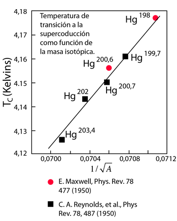 | Efecto Isótopo, Mercurio Si la conducción eléctrica en el mercurio fuera puramente electrónica, no debería haber ninguna dependencia de las masas nucleares. Esta dependencia de la temperatura crítica para la superconductividad, de la masa isotópica, fue la primera evidencia directa de interacción entre los electrones y la red. Esto apoya la teoría BCS, sobre el acoplamiento de la red cristalina con los pares de electrones.  |   | Es muy notable que un fenómeno eléctrico como la transición a la resistividad cero, implicara a una propiedad puramente mecánica de la red. Puesto que un cambio en la temperatura crítica implica un cambio en el entorno de energía asociada con la transición superconductora, esto sugiere que parte de la energía está siendo utilizado para mover los átomos de la red, ya que la energía depende de la masa de la red cristalina. Esto indica que las vibraciones de la red son una parte del proceso de superconducción. Esta fue una clave importante en el proceso de desarrollo de la teoría BCS, ya que sugiere acoplamiento de red, y en el tratamiento cuántico sugerido estuvieron involucrados los fonones. |