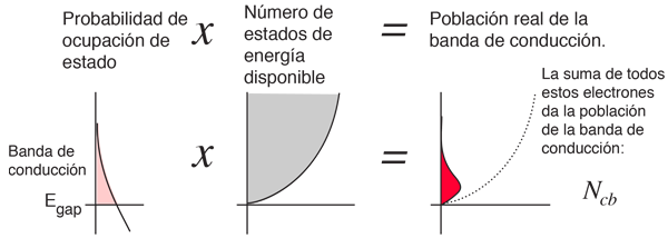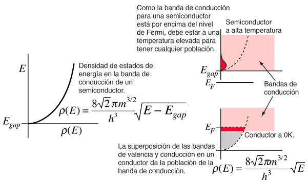 Note que aunque la función de Fermi tiene un valor finito en el hueco, no existe una población de electrones a estas energías (que es lo que quiere decir el hueco). La población depende del producto de la función de Fermi y la densidad de estados de electrones. Así, en el hueco no hay electrones debido a que la densidad de estados es cero. En la banda de conducción a 0ºK, no hay electrones aunque hay un montón de estados disponibles, pero la función de Fermi es cero. A altas temperaturas, tanto la densidad de estados como la función de Fermi tiene valores finitos en la banda de conducción, por lo que hay una población conductora finita.