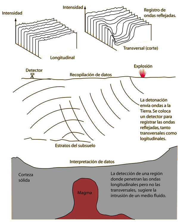 Ejemplo Geológico: Onda Longitudinal y TransversalLas ondas longitudinales se pueden propagar a través de tanto un medio sólido como flúido, pero las ondas transversales o "trasquiladas" no se pueden propagar en un flúido. Esto se puede utilizar como una ventaja en el estudio geológico como se muestra en la ilustración de abajo. ![]() Puesto que las ondas longitudinales viajan a través de sólidos y líquidos, los datos longitudinales se puede utilizar como una referencia para cartografiar los datos de ondas transversales. La recopilación de datos sísmicos de ambas ondas longitudinales y transversales y tomando la diferencia, permite que los experimentadores puedan cartografiar regiones licuadas subterráneas. Ambos tipos de ondas a través del material terrestre se conocen como ondas sísmicas. Las ondas longitudinales son llamadas ondas P y las ondas transversales ondas S. Las ondas P viajan normalmente casi el doble de rápido que las ondas S. Cuando se descubre movimientos de tierra, como el registrado en la región de los Lagos Mammoth de California, este tipo de estudio puede dar una idea acerca de la intrusión de magma debajo de la superficie. |