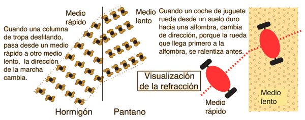 Refracción del SonidoLa refracción es la curvatura de las ondas cuando entran en un medio donde su velocidad es diferente. La refracción con el sonido no es un fenómeno tan importante como con la luz, donde es responsable de la formación de imágenes por lentes, por el ojo, cámaras, etc. Sin embargo la curvatura de las ondas sonoras es una fenómeno interesante en el sonido. ![]() Estas visualizaciones pueden ayudar a entender la naturaleza de la refracción. Una columna de tropas acercándose a un medio donde su velocidad es más lenta, como se muestra, girará hacia la derecha porque el lado derecho de la columna llega primero al medio lento, y por lo tanto se ralentizará antes que la parte izquierda que llega después. Los marchadores de la izquierda, tal vez ajeno a la difícil situación de sus compañeros, siguen marchando hacia adelante a toda velocidad hasta que llegan al medio lento. No sólo cambia la dirección de la marcha, sino que se reduce la separación entre los marchadores. Cuando se aplica a las ondas, esto implica que la dirección de propagación de la onda es desviada hacia la derecha y que la longitud de la onda disminuye. De la relación de onda básica v = fλ, es evidente que una velocidad más lenta debe acortar la longitud de onda, ya que la frecuencia de la onda está determinada por su fuente y no cambia. Otra visualización de refracción puede provenir de la dirección de diversos tipos de tractores, equipos de construcción, tanques y otros vehículos sobre orugas. Si se aplica el freno de la derecha, el vehículo gira a la derecha, ya que se ha desacelerado un lado del vehículo sin disminuir la velocidad del otro lado.