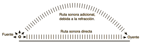 El sonido desde una fuente puntual se propaga en todas las direcciones. Normalmente, el oyente sólo puede oir lo que inicialmente se dirigió hacia él, pero la refracción del sonido lo puede curvar hacia abajo. Normalmente, sólo se recibe el sonido directo. Sin embargo, la refracción puede añadir algo de sonido adicional, amplificando efectivamente el sonido. Sobre lagos fríos, pueden darse lugar a amplificadores naturales. ![]()