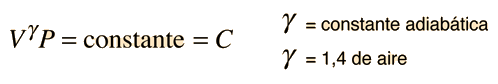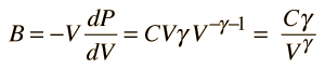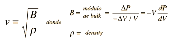| Velocidad del Sonido en un Gas IdealLa velocidad del sonido en un medio uniforme está determinada por su propiedad elástica (módulo de compresibilidad) y su densidad  Cuando un sonido viaja a través de un gas ideal, las compresiones y expansiones rápidas asociadas con la onda longitudinal se pueden esperar que sean razonablemente adiabáticas y por tanto la presión y el volumen obedecen la relación  El supuesto adiabático para las ondas sonoras sólo significa que las compresiones asociadas con la onda de sonido ocurren tan rápidamente que no hay oportunidad para la transferencia de calor en o fuera del volumen de aire. El módulo de compresibilidad por lo tanto, puede ser reformulado haciendo uso de la condición adiabática en la fórmula  por tanto se puede tomar la derivada de la presión P respecto al volumen V.  Como la densidad del gas es  la velocidad del sonido se puede expresar como  Usando la ley de gas ideal PV = nRT lleva a