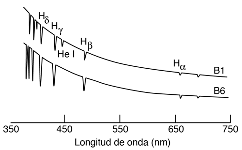 En este tipo se incluyen las estrellas azules con temperaturas de superficie de 20.000 a 35.000 K. La energía térmica es tan grande a estas temperaturas, que la mayor parte del hidrógeno de la superficie está completamente ionizado, por lo que las líneas de hidrógeno (HI) son débiles. El helio ionizado (HeI) es visible, pero los espectros más fuertes son de múltiples átomos ionizados (HeII, CIII, NIII, OIII, SiV). Téngase en cuenta el aumento de la curva espectral hacia el azul, a partir de la curva de radiación de cuerpo negro.