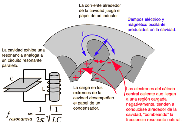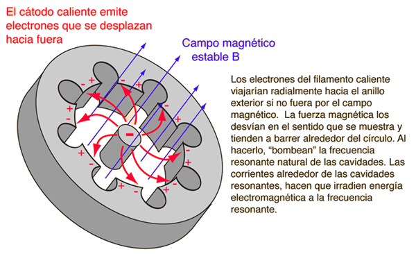 | El MagnetrónLa radiación de microonda del horno microonda y de algunas aplicaciones de radar es producida por un dispositivo llamado magnetrón.  Al magnetrón se le llama en la industria dispositivo de "campo cruzado", porque en su funcionamiento se emplean tanto los campos magnéticos como eléctricos, y estos se producen en direcciones perpendiculares modo que se cruzan. El campo magnético aplicado es constante y se aplica a lo largo del eje del dispositivo circular ilustrado. La alimentación al dispositivo se aplica al cátodo central, que se calienta para suministrar electrones energéticos que, en ausencia de campo magnético, tienden a moverse radialmente hacia el exterior, hacia el ánodo anillo que lo rodea.  Los electrones son liberados del cátodo central caliente, por un proceso de emisión termoiónica y entran en un campo de aceleración que los mueven hacia afuera, hacia el ánodo. El campo magnético axial ejerce una fuerza magnética sobre estas cargas que es perpendicular a su movimiento inicialmente radial, y tienden a ser barridos alrededor del círculo. De esta manera, se hace trabajo sobre las cargas y por lo tanto, se le proporcionan energía de la fuente de alimentación. A medida que estos electrones son barrido hacia un punto donde hay exceso de carga negativa, esa carga tiende a ser empujada de nuevo alrededor de la cavidad, impartiendo energía a la oscilación, a la frecuencia natural de la cavidad. Esta oscilación impulsada de las cargas alrededor de las cavidades, conduce a la radiación de ondas electromagnéticas, que forman la salida del magnetrón.