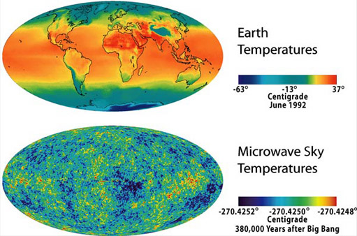 Note that the temperature variation on the Earth covers about 100°C while those measured by WMAP range only over about 0.0004 °C, a smaller range by a factor of a quarter of a million.