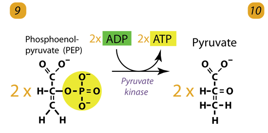 Steps of Glycolysis![]() Glycolysis is a series of reactions which starts with glucose and has the molecule pyruvate as its final product. Pyruvate can then continue the energy production chain by proceeding to the TCA cycle, which produces products used in the electron transport chain to finally produce the energy molecule ATP. The first step in glycolysis is the conversion of glucose to glucose 6-phosphate (G6P) by adding a phosphate, a process which requires one ATP molecule for energy and the action of the enzyme hexokinase. Each step of glycolysis operates with the aid of an enzyme, which greatly speeds up the reactions to allow the process to proceed fast enough for metabolic needs. Ahearn comments that enzymes allow reactions to run at the "speed of life". ![]() This step involves a simple rearrangement of G6P to produce Fructose 6-phosphate (F6P). It forms the substrate for the next step which is crucial control point. ![]() In this step a second ATP is required to add a second phosphate to F6P. This forms Fructose 1,6-biphosphate (F1,6BP). The enzyme involved is Phosphofructokinase (PFK). This enzyme is capable of controlling the entire pathway as seen below. To this point, the process involves rearrangement with the investment of two ATP. This energy is used to add two phosphates, and marks the end of the energy investment phase. ![]() Catalyzed by the enzyme aldolase, the F1,6BP is split into two three-carbon molecules, Dihydroxyacetone phosphate (DHAP) and Glyceraldehyde 3-phosphate (G3P). These two molecules are isomers, and each can be easily rearranged into the other. ![]() Catalyzed by Triose phosphate isomerase, the DHAP is quickly rearranged to produce a second G3P. The process to this point has converted one 6-carbon molecule of glucose into two 3-carbon G3P molecules. ![]() Starting at this step, glycolysis becomes a process of energy generation where ATP is made. At the beginning of this process, the G3P is converted to 1,3-bisphosphoglycerate. This involves the addition of another phosphate. In this process the adehyde molecule is converted into an acid.This process of conversion of the aldehyde to an acid is an oxidation. In the process the molecule being oxidized loses two electrons, and it gives those two electrons to NAD+ which accepts them plus a proton to produce NADH. We had two G3P molecules, so we we get two molecules of 1,3 bisphosphoglycerate, and gain two NADHs out of this reaction. These will be used in the electron transport chain to provide a much bigger energy payoff. The acid group created by the oxidation reaction gives a phosphate to 1,3 bisphosphoglycerate. This phosphate addition is different from the ones seen so far which required ATP energy. This phosphate is not from ATP, but is a free phosphate added onto the acid. The energy for doing this comes from the oxidation of the same step. That's why we don't need ATP energy to add the phosphate. The net output from this step is two 1,3 bisphosphoglycerates and two NADHs. ![]() This step begins the part of glycolysis where ATP is made. First, a phosphate is transferred away from each of the two 1,3 Bisphosphoglycerates to add to ADP and make ATP. This leaves behind two molecules of 3-Phosphoglycerate. ![]() The two molecules of 3-Phosphoglycerate undergo rearrangement to produce 2-Phosphoglycerate. ![]() The two 2-Phosphoglycerate molecules with the action of the enolase enzyme form two molecules of phosphoenylpyruvate (PEP). PEP is the substrate for the final step of glycolysis. ![]() With the aid of the enzyme pyruvate kinase, the final step produces two ATPs and two molecules of pyruvate. There is enough energy left over to almost produce two more ATPs, but since it falls short, this energy is given off as heat. ![]()