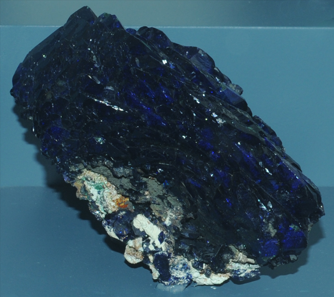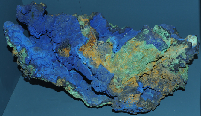 These images are two parts of a section of a wall of a cave near Bisbee, Arizona. It is on display at Smithsonian Museum of Natural History. It shows the blue of azurite and the green of malachite.