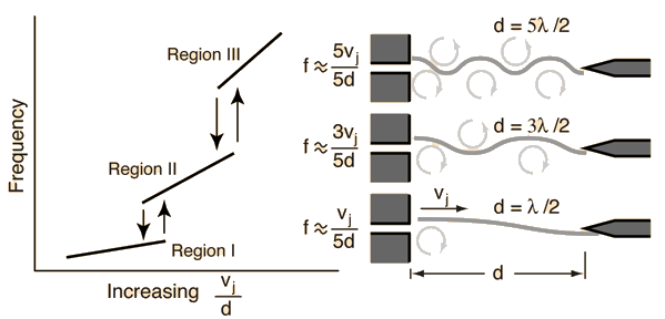 Increasing Airstream VelocityFor a given distance between a slit and an edge, the edgetone frequency increases with airstream velocity, but may break up or down to a different region with changes in the airstream velocity. At a given airstream velocity, a fairly stable tone may be maintained, attributable to a feedback mechanism. ![]()