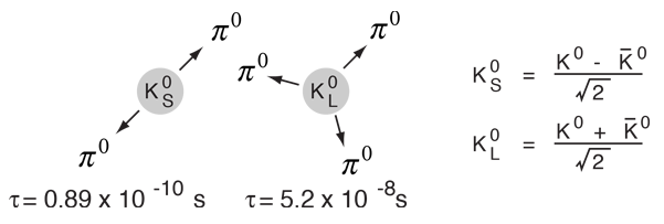 In 1964, Cronin and Fitch performed a beam experiment in which they measured the decay of pions at the end of a 57 foot beamline. Given the disparity of the lifetimes of the two kaon species, you expect to see only the long-lived version at the end of the beam tube, but they found about 1 in 500 decays to be 2-pion decays, characteristic of the short-lived species.