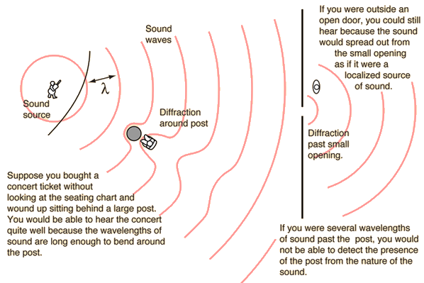 Diffraction of SoundDiffraction: the bending of waves around small* obstacles and the spreading out of waves beyond small* openings. * small compared to the wavelength![]() Important parts of our experience with sound involve diffraction. The fact that you can hear sounds around corners and around barriers involves both diffraction and reflection of sound. Diffraction in such cases helps the sound to "bend around" the obstacles. The fact that diffraction is more pronounced with longer wavelengths implies that you can hear low frequencies around obstacles better than high frequencies, as illustrated by the example of a marching band on the street. Another common example of diffraction is the contrast in sound from a close lightning strike and a distant one. The thunder from a close bolt of lightning will be experienced as a sharp crack, indicating the presence of a lot of high frequency sound. The thunder from a distant strike will be experienced as a low rumble since it is the long wavelengths which can bend around obstacles to get to you. There are other factors such as the higher air absorption of high frequencies involved, but diffraction plays a part in the experience. You may perceive diffraction to have a dual nature, since the same phenomenon which causes waves to bend around obstacles causes them to spread out past small openings. This aspect of diffraction also has many implications. Besides being able to hear the sound when you are outside the door as in the illustration above, this spreading out of sound waves has consequences when you are trying to soundproof a room. Good soundproofing requires that a room be well sealed, because any openings will allow sound from the outside to spread out in the room - it is surprising how much sound can get in through a small opening. Good sealing of loudspeaker cabinets is required for similar reasons. Another implication of diffraction is the fact that a wave which is much longer than the size of an obstacle, like the post in the auditorium above, cannot give you information about that obstacle. A fundamental principle of imaging is that you cannot see an object which is smaller than the wavelength of the wave with which you view it. You cannot see a virus with a light microscope because the virus is smaller than the wavelength of visible light. The reason for that limitation can be visualized with the auditorium example: the sound waves bend in and reconstruct the wavefront past the post. When you are several sound wavelengths past the post, nothing about the wave gives you information about the post. So your experience with sound can give you insights into the limitations of all kinds of imaging processes.