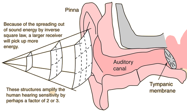 The Outer EarSound energy spreads out from its sources. For a point source of sound, it spreads out according to the inverse square law. For a given sound intensity, a larger ear captures more of the wave and hence more sound energy. The outer ear structures act as part of the ear's preamplifier to enhance the sensitivity of hearing. ![]() The auditory canal acts as a closed tube resonator, enhancing sounds in the range 2-5 kiloHertz. |