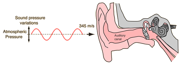 Audible SoundUsually "sound" is used to mean sound which can be perceived by the human ear, i.e., "sound" refers to audible sound unless otherwise classified. A reasonably standard definition of audible sound is that it is a pressure wave with frequency between 20 Hz and 20,000 Hz and with an intensity above the standard threshold of hearing. Since the ear is surrounded by air, or perhaps under water, the sound waves are constrained to be longitudinal waves. Normal ranges of sound pressure and sound intensity may also be specified.