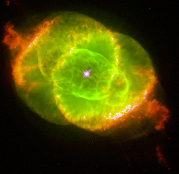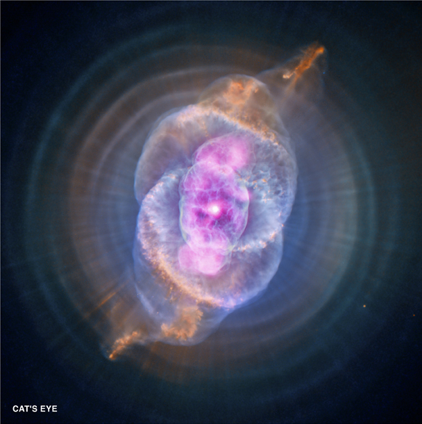 | Catseye Nebula This image of the planetary nebula NGC 6543 was captured by the Hubble Space Telescope. It is one of the most complex planetary nebulae ever seen. The Hubble image reveals "surprisingly intricate structures including concentric gas shells, jets of high-speed gas and unusual shock-induced knots of gas. Estimated to be 1,000 years old, the nebula is a visual "fossil record" of the dynamics and late evolution of a dying star. A preliminary interpretation suggests that the star might be a double-star system. The suspected companion star also might be responsible for a pair of high-speed jets of gas that lie at right angles to this equatorial ring. If the companion were pulling in material from a neighboring star, jets escaping along the companion's rotation axis could be produced. These jets would explain several puzzling features along the periphery of the gas lobes. Like a stream of water hitting a sand pile, the jets compress gas ahead of them, creating the "curlicue" features and bright arcs near the outer edge of the lobes. The twin jets are now pointing in different directions than these features. This suggests the jets are wobbling, or precessing, and turning on and off episodically.  Photo credit: NASA J.P.Harrington and K.J.Borkowski University of Maryland.  Adding drama to the Cats Eye, this view superimposes the X-ray image of the nebula upon the visual image above. The X-ray image, shown in purple, was taken by the Chandra X-ray Observatory.