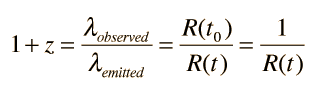Another application of the z parameter is to imply the scale factor R of the universe at the time that light was emitted from a given observed object. The z parameter is related to R by the expression