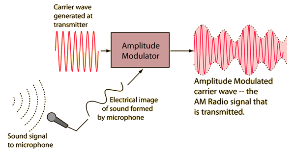 AM Radio![]() AM radio uses the electrical image of a sound source to modulate the amplitude of a carrier wave. At the receiver end in the detection process, that image is stripped back off the carrier and turned back into sound by a loudspeaker. When information is broadcast from an AM radio station, the electrical image of the sound (taken from a microphone or other program source) is used to modulate the amplitude of the carrier wave transmitted from the broadcast antenna of the radio station. This is in contrast to FM radio where the signal is used to modulate the frequency of the carrier. The AM band of the Electromagnetic spectrum is between 535 KHz and 1605 kHz and the carrier waves are separated by 10 kHz. A radio receiver can be tuned to receive any one of a number of radio carrier frequencies in the area of the receiver. This is made practical by transferring the signal from the carrier onto an intermediate frequency in the radio by a process called heterodyning. In a heterodyne receiver, most of the electronics is kept tuned to the intermediate frequency so that only a small portion of the receiver circuit must be retuned when changing stations.
