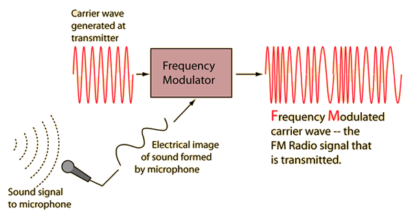 FM Radio![]() FM radio uses the electrical image of a sound source to modulate the frequency of a carrier wave. At the receiver end in the detection process, that image is stripped back off the carrier and turned back into sound by a loudspeaker. When information is broadcast from an FM radio station, the electrical image of the sound (taken from a microphone or other program source) is used to modulate the frequency of the carrier wave transmitted from the broadcast antenna of the radio station. This is in contrast to AM radio where the signal is used to modulate the amplitude of the carrier. The FM band of the electromagnetic spectrum is between 88 MHz and 108 MHz and the carrier waves for individual stations are separated by 200 kHz for a maximum of 100 stations. These FM stations have a 75 kHz maximum deviation from the center frequency, which leaves 25 kHz upper and lower "gaurd bands" to minimize interaction with the adjacent frequency band. This separation of the stations is much wider than that for AM stations, allowing the broadcast of a wider frequency band for higher fidelity music broadcast. It also permits the use of sub-carriers which make possible the broadcast of FM Stereo signals.