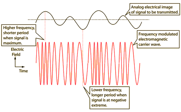Frequency Modulation![]() The change in frequency, which is greatly exaggerated here, is proportional to the amplitude of the signal. An FM radio carrier around 100 MHz is limited to modulation of +/- 0.1 MHz. Normal FM stereo broadcast is within +/- .053 MHz.