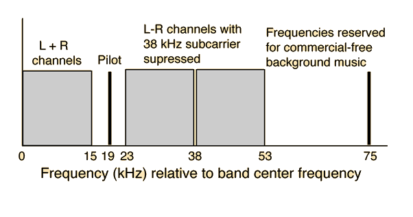 FM Stereo Broadcast BandThe bandwidth assigned to each FM station is sufficently wide to broadcast high-fidelity, stereo signals. The carrier frequency is directly modulated with the sum of the left and right channel audio signals. A 38 kHz subcarrier also modulates the carrier, and that subcarrier is modulated with the difference, L- R , of the audio signals. The FM tuner then decodes this signal and separates the Left and Right audio channels. ![]()