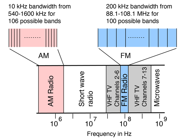 AM and FM Radio FrequenciesThe Amplitude Modulated (AM radio) carrier frequencies are in the frequency range 535-1605 kHz. Carrier frequencies of 540 to 1600 kHz are assigned at 10 kHz intervals. The FM radio band is from 88 to 108 MHz between VHF television Channels 6 and 7. The FM stations are assigned center frequencies at 200 kHz separation starting at 88.1 MHz, for a maximum of 100 stations. These FM stations have a 75 kHz maximum deviation from the center frequency, which leaves 25 kHz upper and lower "guard bands" to minimize interaction with the adjacent frequency band. ![]()