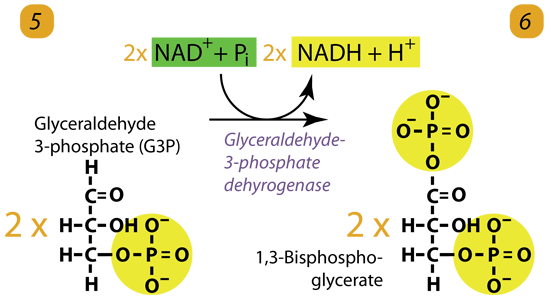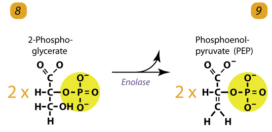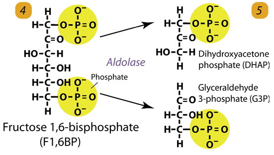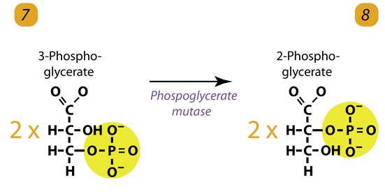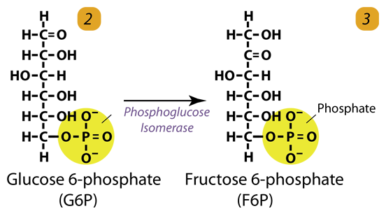 Steps of Glycolysis![]() Glycolysis is a series of reactions which starts with glucose and has the molecule pyruvate as its final product. Pyruvate can then continue the energy production chain by proceeding to the TCA cycle, which produces products used in the electron transport chain to finally produce the energy molecule ATP. The first step in glycolysis is the conversion of glucose to glucose 6-phosphate (G6P) by adding a phosphate, a process which requires one ATP molecule for energy and the action of the enzyme hexokinase. Each step of glycolysis operates with the aid of an enzyme, which greatly speeds up the reactions to allow the process to proceed fast enough for metabolic needs. Ahearn comments that enzymes allow reactions to run at the "speed of life". ![]() This step involves a simple rearrangement of G6P to produce Fructose 6-phosphate (F6P). It forms the substrate for the next step which is crucial control point. ![]() In this step a second ATP is required to add a second phosphate to F6P. This forms Fructose 1,6-biphosphate (F1,6BP). The enzyme involved is Phosphofructokinase (PFK). This enzyme is capable of controlling the entire pathway as seen below. To this point, the process involves rearrangement with the investment of two ATP. This energy is used to add two phosphates, and marks the end of the energy investment phase. ![]() Catalyzed by the enzyme aldolase, the F1,6BP is split into two three-carbon molecules, Dihydroxyacetone phosphate (DHAP) and Glyceraldehyde 3-phosphate (G3P). These two molecules are isomers, and each can be easily rearranged into the other. ![]() Catalyzed by Triose phosphate isomerase, the DHAP is quickly rearranged to produce a second G3P. The process to this point has converted one 6-carbon molecule of glucose into two 3-carbon G3P molecules. ![]() Starting at this step, glycolysis becomes a process of energy generation where ATP is made. At the beginning of this process, the G3P is converted to 1,3-bisphosphoglycerate. This involves the addition of another phosphate. In this process the adehyde molecule is converted into an acid.This process of conversion of the aldehyde to an acid is an oxidation. In the process the molecule being oxidized loses two electrons, and it gives those two electrons to NAD+ which accepts them plus a proton to produce NADH. We had two G3P molecules, so we we get two molecules of 1,3 bisphosphoglycerate, and gain two NADHs out of this reaction. These will be used in the electron transport chain to provide a much bigger energy payoff. The acid group created by the oxidation reaction gives a phosphate to 1,3 bisphosphoglycerate. This phosphate addition is different from the ones seen so far which required ATP energy. This phosphate is not from ATP, but is a free phosphate added onto the acid. The energy for doing this comes from the oxidation of the same step. That's why we don't need ATP energy to add the phosphate. The net output from this step is two 1,3 bisphosphoglycerates and two NADHs. ![]() This step begins the part of glycolysis where ATP is made. First, a phosphate is transferred away from each of the two 1,3 Bisphosphoglycerates to add to ADP and make ATP. This leaves behind two molecules of 3-Phosphoglycerate. ![]() The two molecules of 3-Phosphoglycerate undergo rearrangement to produce 2-Phosphoglycerate. ![]() The two 2-Phosphoglycerate molecules with the action of the enolase enzyme form two molecules of phosphoenylpyruvate (PEP). PEP is the substrate for the final step of glycolysis. ![]() With the aid of the enzyme pyruvate kinase, the final step produces two ATPs and two molecules of pyruvate. There is enough energy left over to almost produce two more ATPs, but since it falls short, this energy is given off as heat. ![]()
