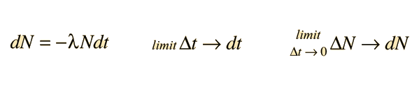 Differential FormAs a precursor to carrying out calculus operations such as derivatives and integrals, a mathematical expression will have to be placed in the differential form for the application of the methods of continuous variables. For example, a finite difference expression occurs in the development of the relationship for radioactive decay: ![]() It is standard practice to use the Greek letter Δ to represent a finite difference. Often the finite difference relationship is only approximately true and is exactly true only in the limit where the differences become infinitesmally small. In this limit, the time interval Δt becomes vanishingly small and as a result, the number of decays N also becomes vanishingly small. The Δ is replaced by the differential symbol d and the resulting form ![]() is said to be the differential form of the expression. |