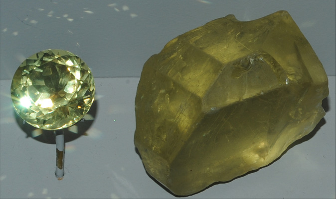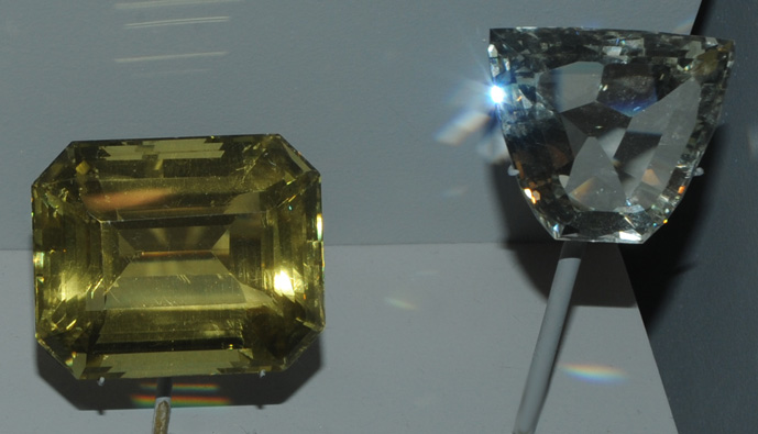 | These orthoclase gems are 249.5 and 126.4 carats and are from Madagascar. |