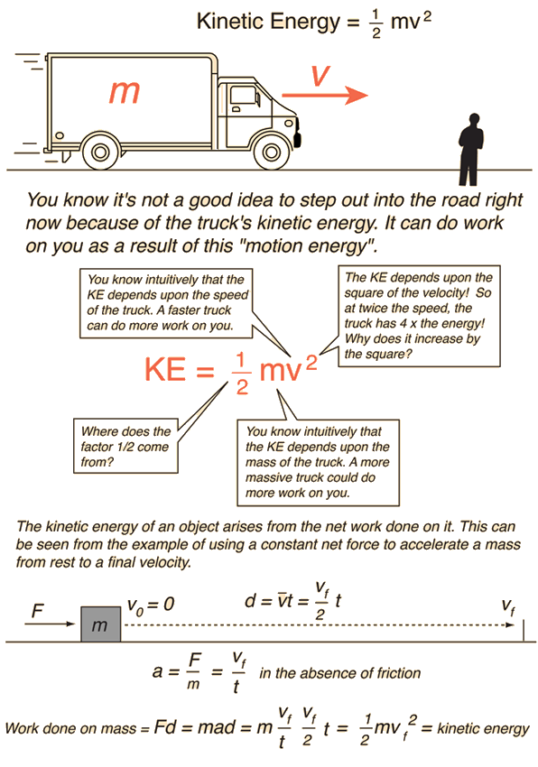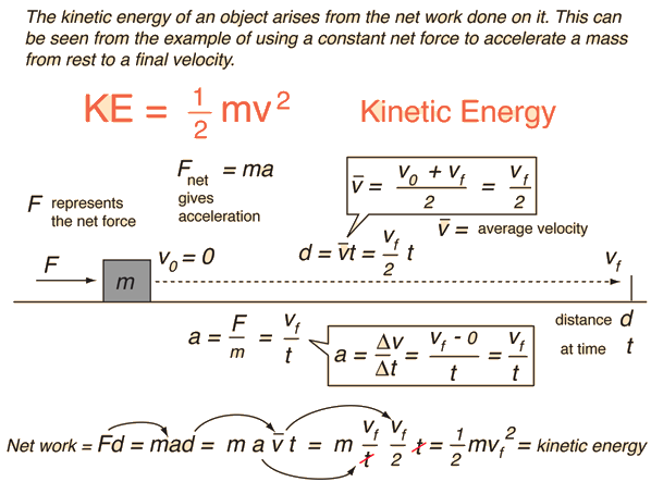 More Detail on Kinetic Energy ConceptKinetic energy is energy of motion. The kinetic energy of an object is the energy it possesses because of its motion. The kinetic energy of a point mass m is given by ![]() Concepts involved in relating net work to change in kinetic energy: