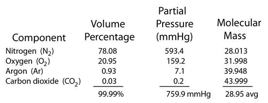Constituents of the AirThe constituents of dry air can be expressed as volume percentages, which will translate to the partial pressures out of the total atmospheric pressure ![]() Since a mole of any ideal gas occupies the same volume, it follows that the volume percentage is also the percentage by number. The average molecular mass can then be found by weighting the masses by their volume percentages above.