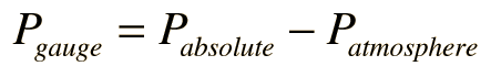 Gauge PressureDoes the flat tire on your automobile have zero air pressure? If it is completely flat, it still has the atmospheric pressure air in it. To be sure, it has zero useful pressure in it, and your tire gauge would read zero pounds per square inch. Most gauges read the excess of pressure over atmospheric pressure and this excess is called "gauge pressure". While a useful measurement for many practical purposes, it must be converted to absolute pressure for applications like the ideal gas law. Since a partial vacuum will be below atmospheric pressure, the phrase "negative pressure" is often used. Certainly there is no such thing as a negative absolute pressure, but small decreases in pressure are commonly used to entrain fluids in sprayers, in carburetors for automobiles, and many other applications. In the case of respiration, we say that the lungs produce a negative pressure of about -4 mmHg to take in air, which of course means a 4 mmHg decrease from the surrounding atmospheric pressure. ![]()