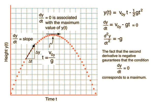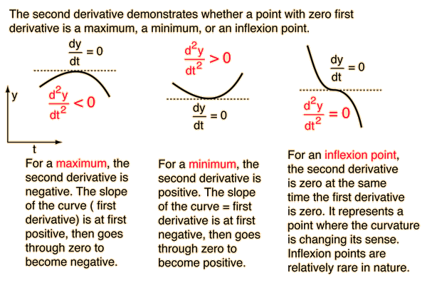 | Maxima and Minima from CalculusOne of the great powers of calculus is in the determination of the maximum or minimum value of a function. Take f(x) to be a function of x. Then the value of x for which the derivative of f(x) with respect to x is equal to zero corresponds to a maximum, a minimum or an inflexion point of the function f(x). For example, the height of a projectile that is fired straight up is given by the motion equations: Taking y0 = 0, a graph of the height y(t) is shown below.  The derivative of a function can be geometrically interpreted as the slope of the curve of the mathematical function y(t) plotted as a function of t. The derivative is positive when a function is increasing toward a maximum, zero (horizontal) at the maximum, and negative just after the maximum. The second derivative is the rate of change of the derivative, and it is negative for the process described above since the first derivative (slope) is always getting smaller. The second derivative is always negative for a "hump" in the function, corresponding to a maximum.  For the simple function used in the example, there is only one maximum. More complex functions can have multiple maxima and minima, and the evaluation of the second derivative provides a way to distinguish them.