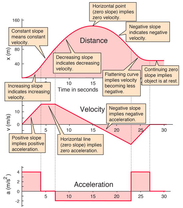 A considerable amount of information about the motion can be obtained by examining the slope of the various graphs. The slope of the graph of position as a function of time is equal to the velocity at that time, and the slope of the graph of velocity as a function of time is equal to the acceleration. |