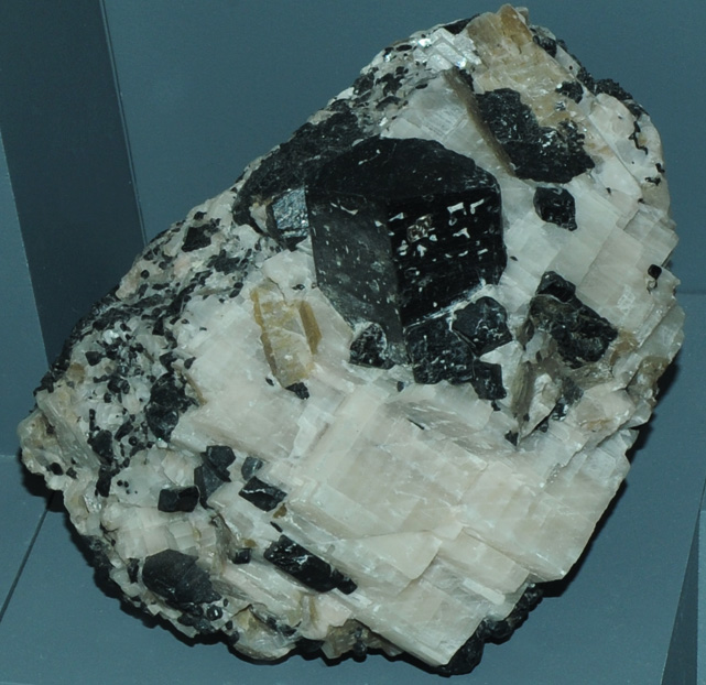 These samples of hornblende are displayed in the Smithsonian Museum of Natural History. Hornblende is one of the basic silicate minerals. Its composition is Ca2(Mg,Fe,Al)5(Si,Al)8O22(OH)2. Hornblende is the most common example of the group of silicates called amphibole. The sample at left is about 12x8 cm and is from Ontario, Canada.