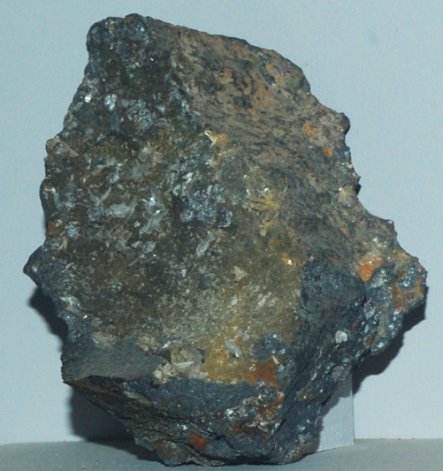 This sample of laurionite is displayed in the Smithsonian Museum of Natural History. Laurionite is a compound of lead and chlorine with the composition PbCl(OH). The sample at left is about 8 cm across and is from Laurion, Attike, Greece. Laurionite is typically colorless according to Mindat, so it appears that the small clear crystals are the laurionite in this sample.